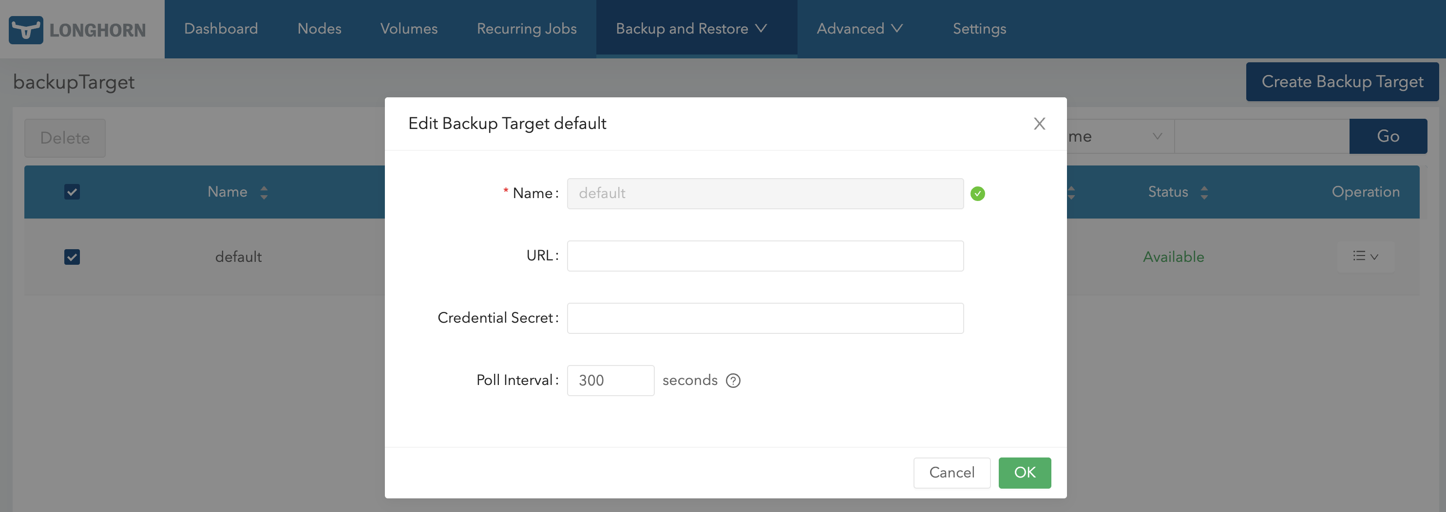 On the Longhorn UI, go to Backup and Restore > Backup Targets, and then create or edit a backup target.